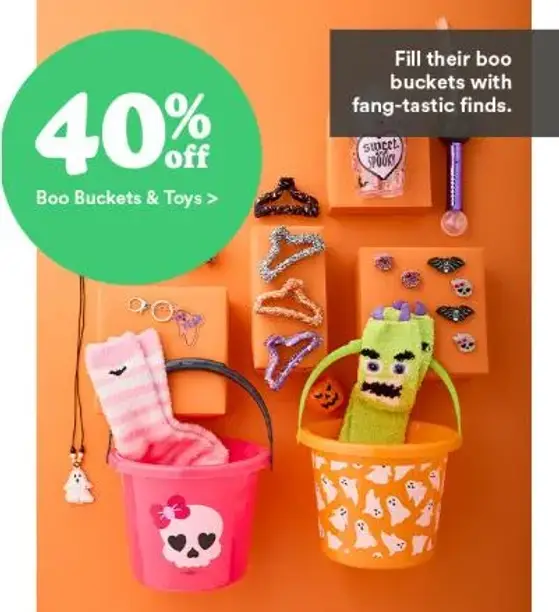 Hurry in and save! Shop in store and get 40% off on boo buckets & toys.