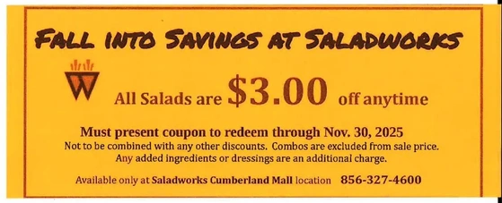 Fall into savings at Saladworks at Cumberland Mall-NJ!