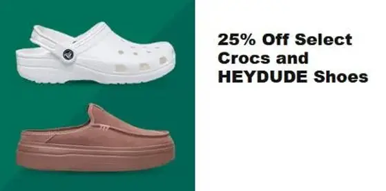 Act fast! Shop in store and get 25% off select Crocs and HEYDUDE shoes.