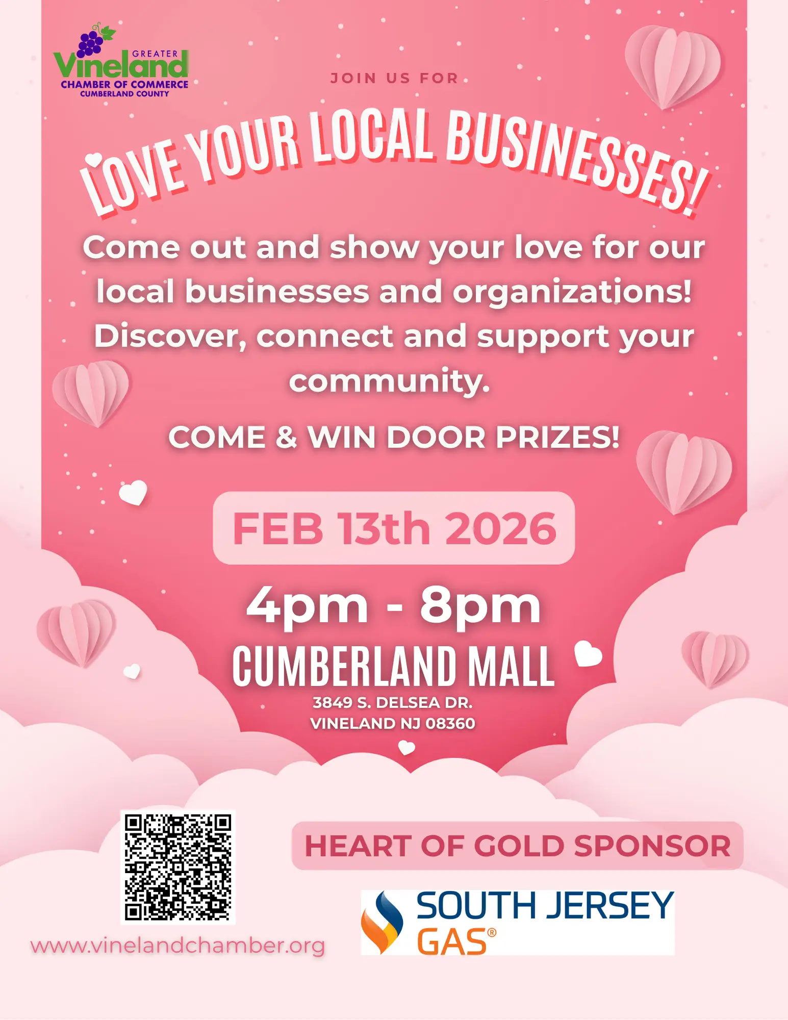 Celebrate community spirit this Valentine’s season at the “Love Your Local Businesses” event! Join the Vineland Chamber of Commerce at Cumberland Mall for an evening dedicated to discovering and supporting the incredible local businesses and organizations that make our area thrive.